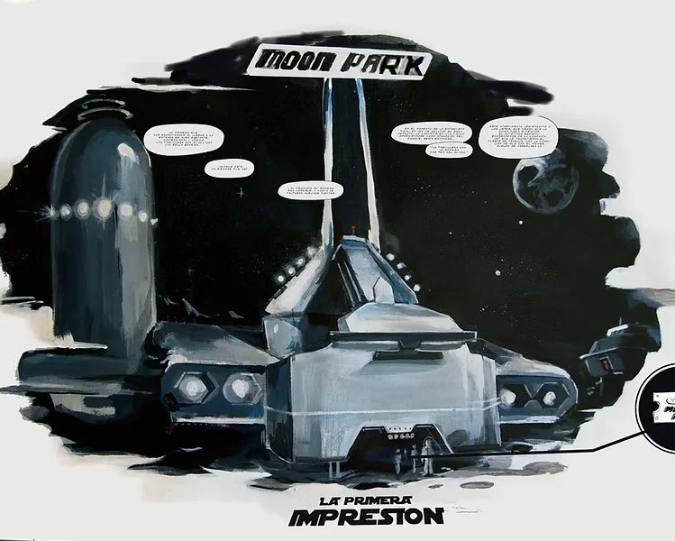Moon Park, surge de un hecho real: la compra por parte del artista, de un terreno lunar a la empresa americana “Lunar embassy”, para a partir de él, construir un parque temático en el que cualquier cosa es posible.
